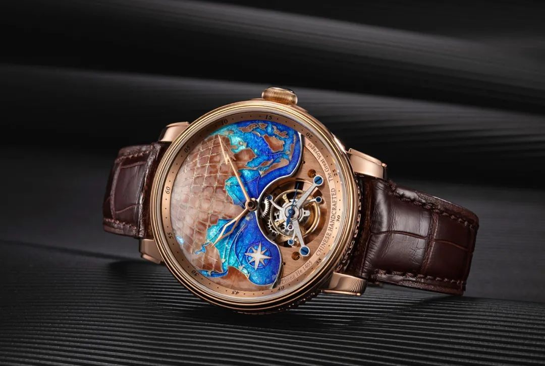 表盘上是一幅郑和舰船远征路线的古地图,珐琅画家采用古老而罕有的大明火珐琅焙烧制作表盘,以大火反复焙烧,使珐琅玻璃化,表底镌刻郑和船舰主题,于腕间之上书刻出七下西洋、领航四海背后的领袖远见与王者盛威,向⼈类社会的引领者们致敬。